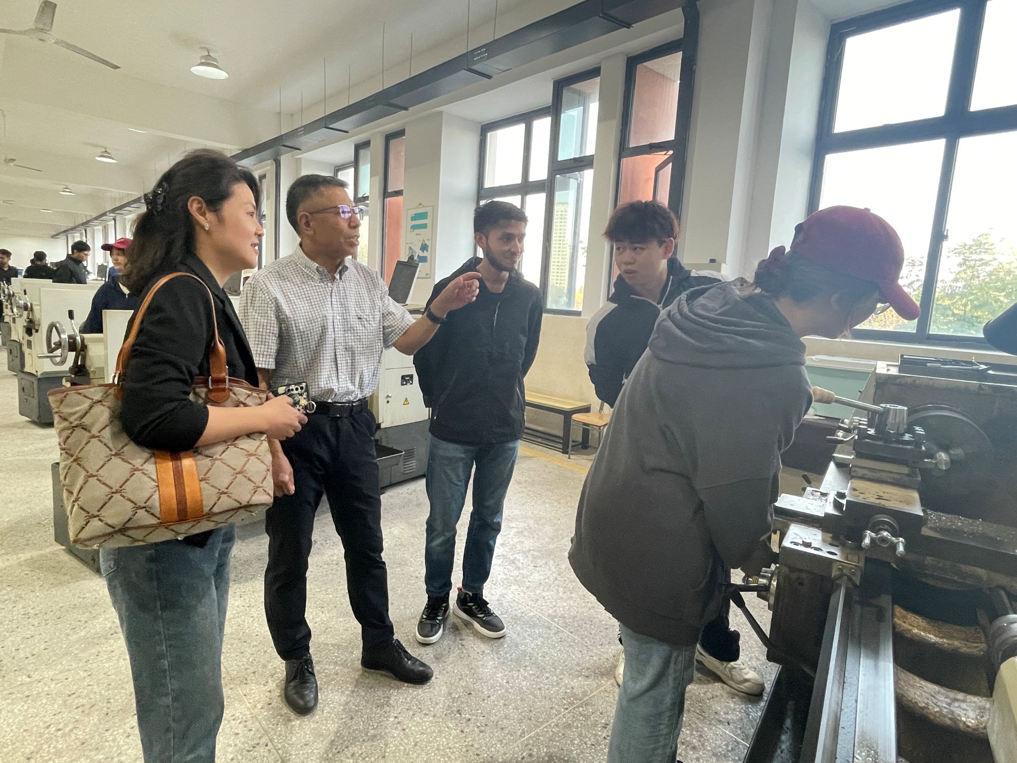 公司领导老师深入实习现场,与职工们亲切交流,询问员工实习学习、生活起居等情况。同学们见到公司领导老师非常激动和开心,积极与老师分享实习期间的感悟体会。交流中,万永敏书记充分肯定了职工们的学习状态,并结合实际向职工们提出两点要求,一是要注意安全,严格遵守规章制度,做到文明实习安全实习;二是要珍惜机会,在将理论知识与实践相融合的同时,通过实习过程中的交流学好中文。随后,万永敏书记一行在校教务处王大庆老师的陪同下,依次参观了实基地车工、铸工和焊工等车间,了解了职工实学习的内容和体系。