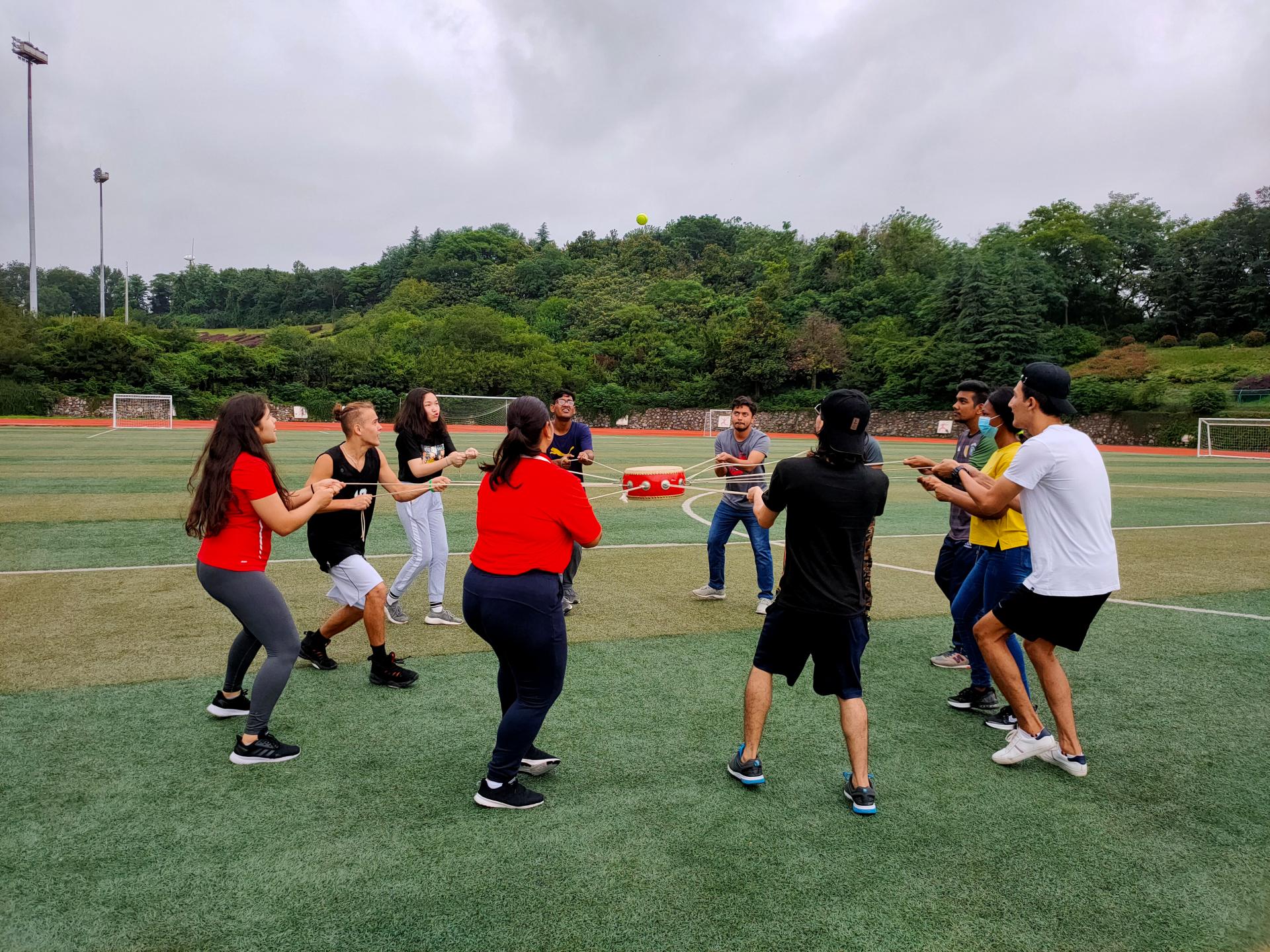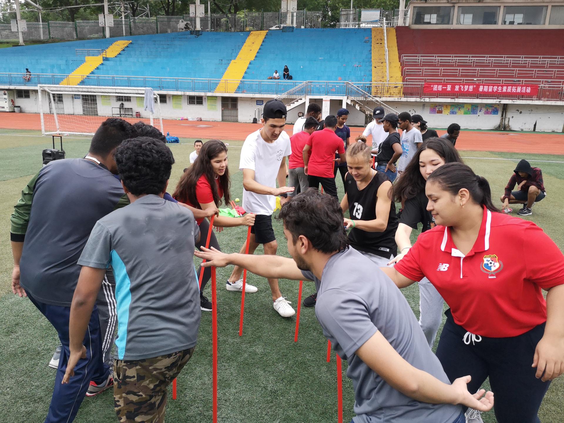 本次素质拓展活动包括合弹同心鼓、不倒森林、接力高尔夫、转圈弹瓶盖四个项目。同学们随机分成四组,以团队合作形式开展活动,每个项目都得到大家的热情参与。运动场上笑声不断,气氛热烈,大家相互积极沟通、群策群力,顺利完成各项活动。最引人注目的是“同心鼓”项目,团队成员通过各自手中的绳子控制鼓的平衡,共同用力使鼓面击球,并及时移动,确保球弹起后不落地,考验团队协作能力。以孟加拉国同学为主的红队通过不断磨合、降低重心,最终完成了73个网球不落地的好成绩,获得第一名。