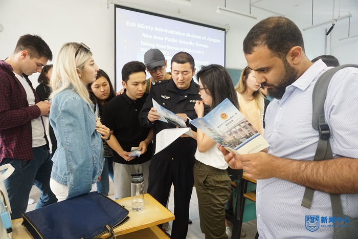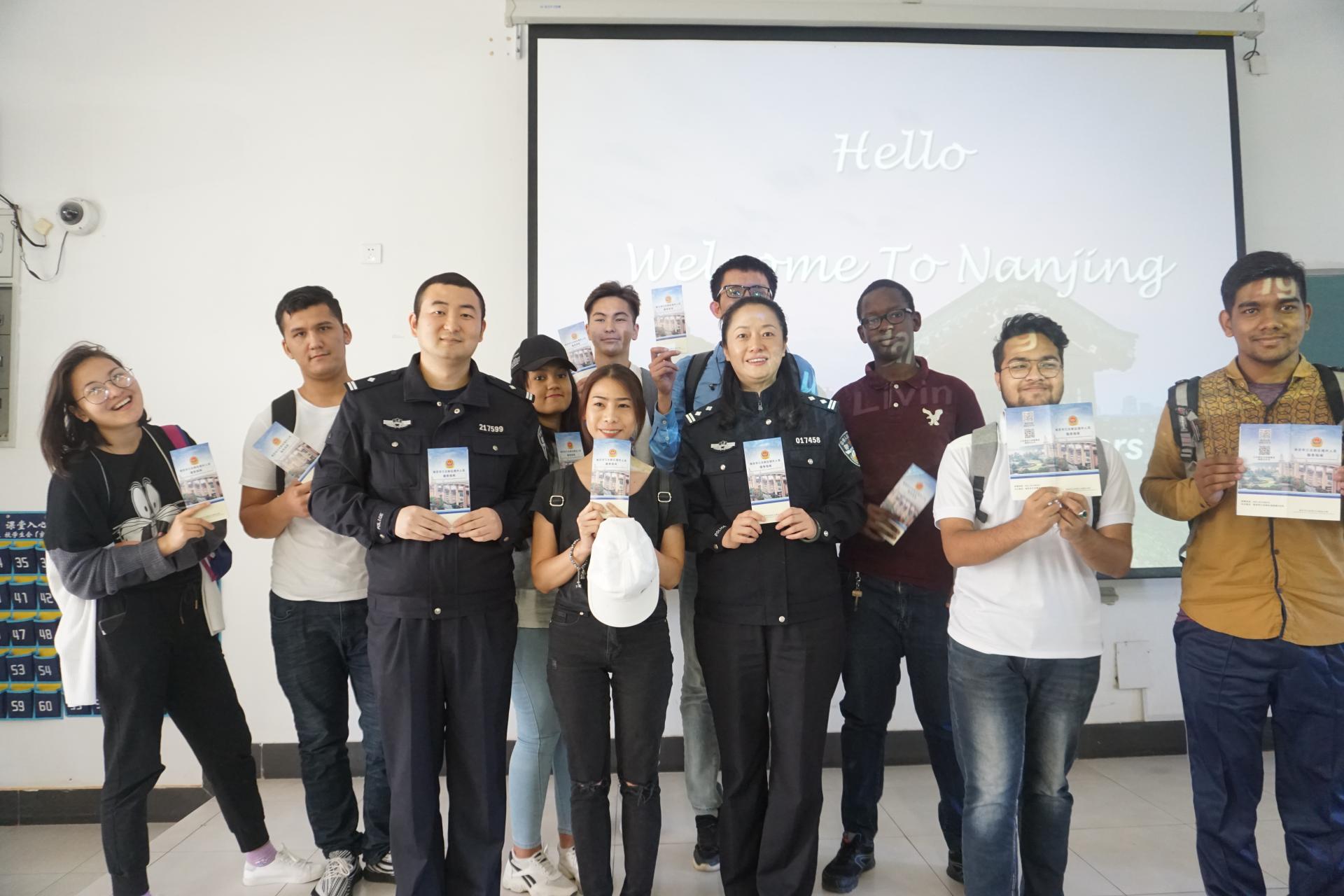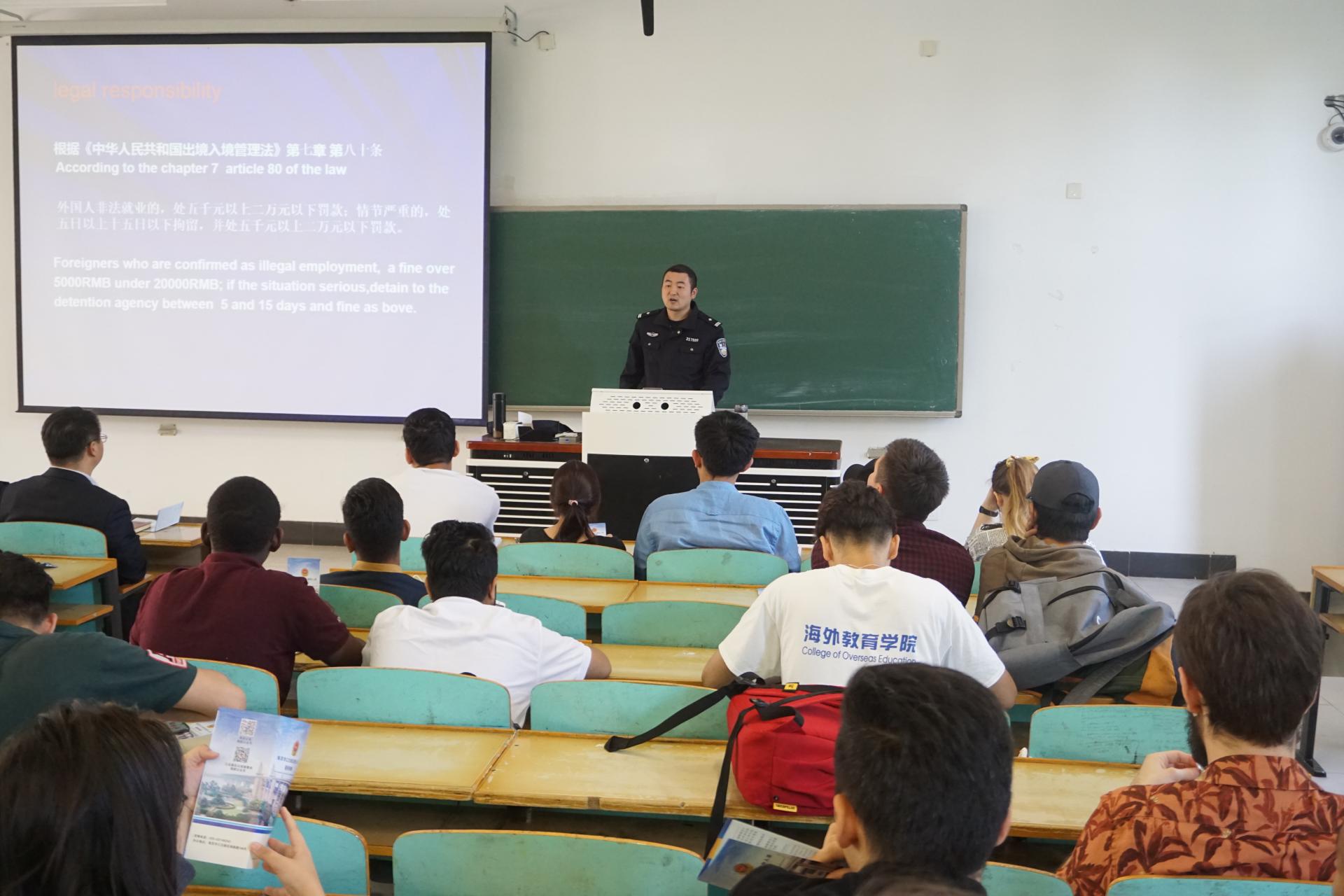 王燕大队长向职工们介绍了外国人在华的安全常识,发放了《南京市江北新区境外人员服务指南》,介绍了相关事务的办事流程。吴越警官结合一些外国来华人员在中国发生的具体案例,图文并茂的介绍了我国出入境法律法规以及禁毒、防诈骗、网络和交通安全等方面的知识。强调每位同学都要遵纪守法、加强安全意识,杜绝安全隐患。