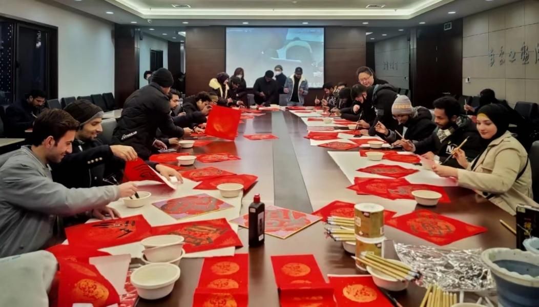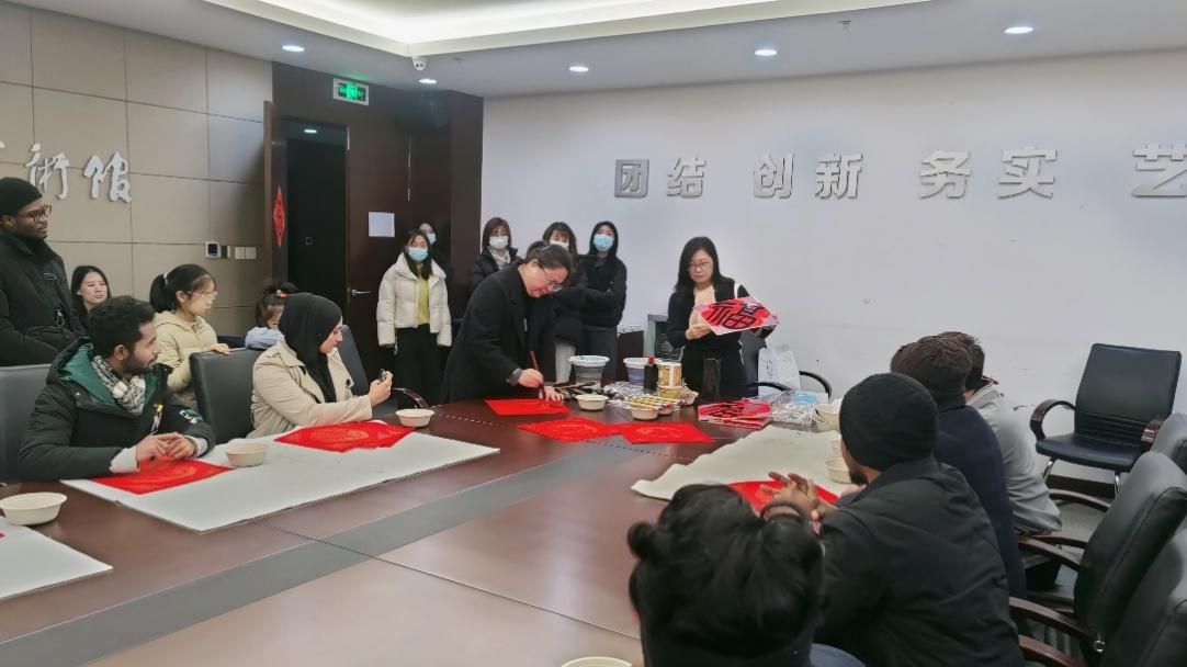 随后,南京书画院青年书画院秘书长程娇龙为师生们现场展示了甲骨文、草书等六种“福”字的写法,刘儒杰、吴宣霖等青年艺术家教导员工们正确执笔法。来华职工们兴致高昂,纷纷尝试亲自写自己喜爱的“福”字。美术馆会议室内,大家共同挥春迎接中国新年的到来,春意融融。