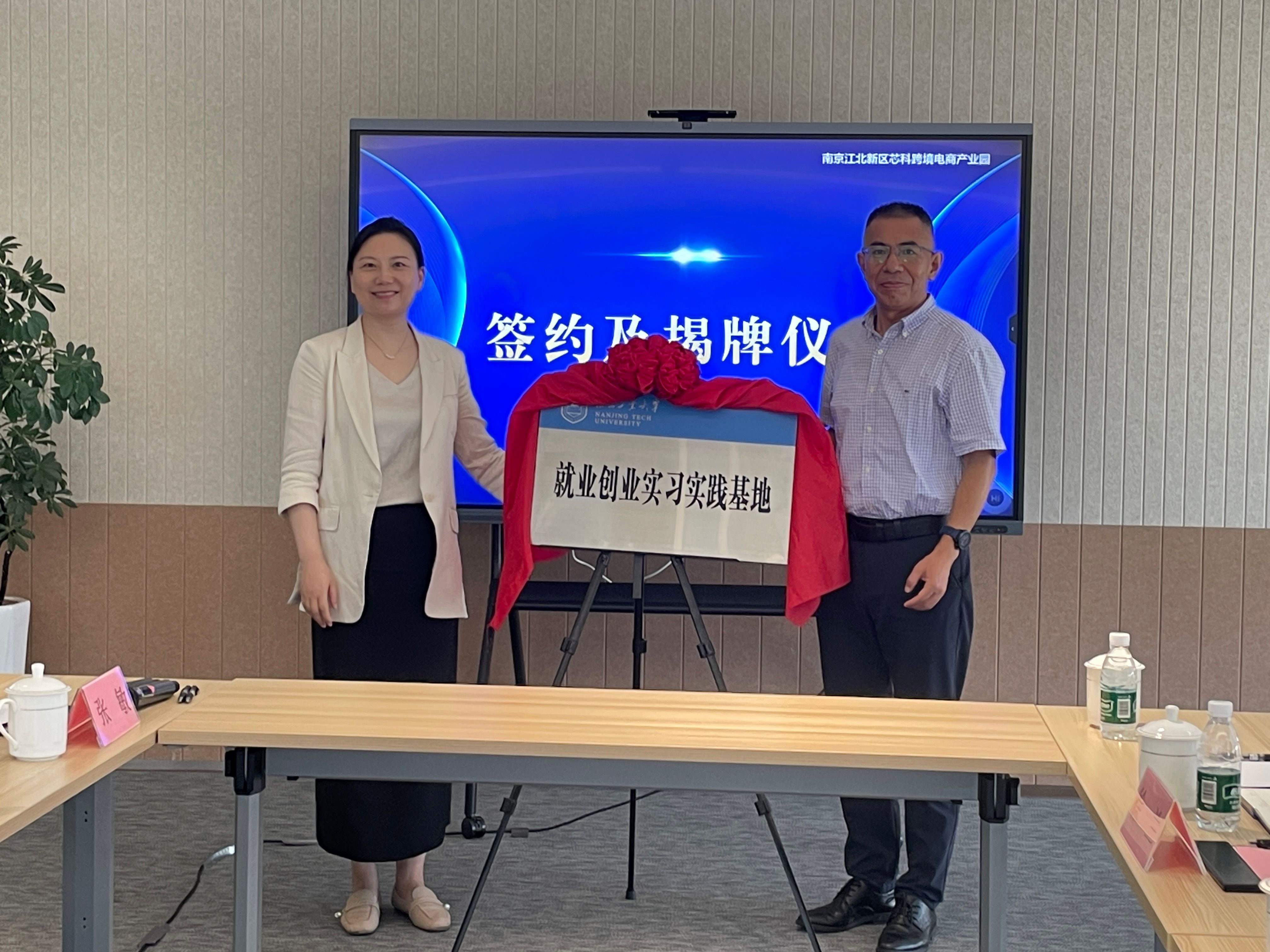 近日,太阳集团tyc151cc与南京江北新区科技投资集团举行来华职工就业创业实习实践基地签约挂牌仪式。南京江北新区科投集团副总经理戴慧、招商中心副主任高阳,海外教育公司党总支书记万永敏、副经理朱丹以及职工管理办公室全体老师、职工代表在江北新区芯科跨境电商产业园共建交流。