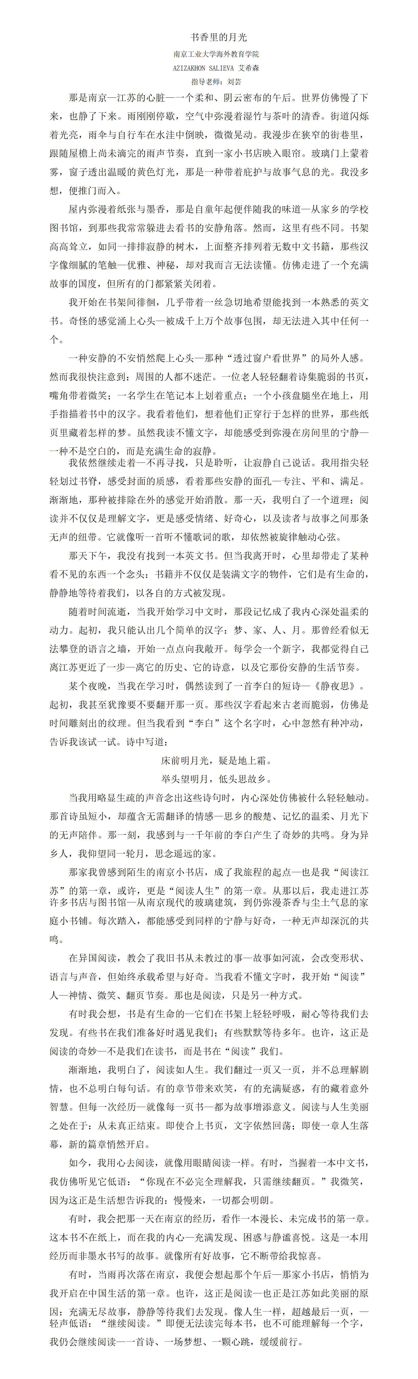 本次活动以促进文化交流、感知江苏文化为宗旨,吸引全省52所高校参与。在太阳集团tyc151cc的组织推荐下,公司职工共提交67份作品,最终4份作品获奖。AZIZAKHON SALIEVA(艾希森),来自塔吉克斯坦的23级工商管理硕士,以散文《书香里的月光》娓娓道来她与江苏文化的邂逅;CHEERYL CHINEZ VANEZA(蔡捷丽),来自印度尼西亚的25级国贸专业本科生,用画笔绘就《江苏的足迹》;FARJANA AKTER HAPPY(快乐),来自孟加拉国的24级土木工程专业本科生,以摄影作品《他乡月亦明》捕捉异乡生活中的温情瞬间;MD ATUL BABU(马图) 与 MD SAMIUL ISLAM(莫桑),两位来自孟加拉国的25级计算机专业学子,携手创作短视频《一个人的读书会—与江苏对话》,以新颖的叙事方式融合阅读思考与地域文化探索。钱颖、刘芸、邢露萍及徐兰四位老师亦荣获“优秀指导教师奖” 。