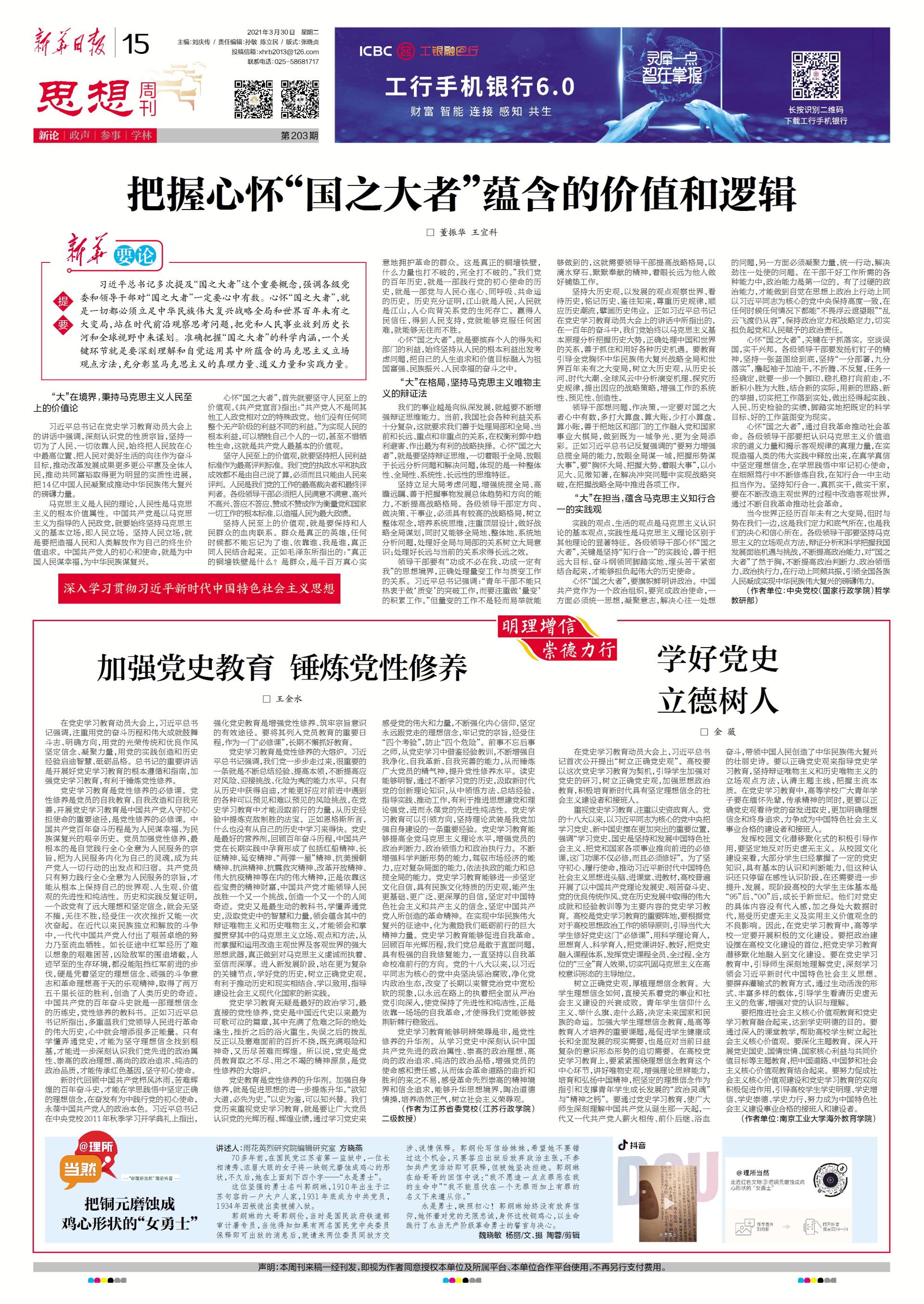 新时代,我们一定要把党史教育和立德树人实现有机结合,通过对党史的学习教育,引导青年自觉把爱国之情、强国之志融入祖国发展的伟大事业之中,文章刊出后相继被交汇点等主流媒体转载。