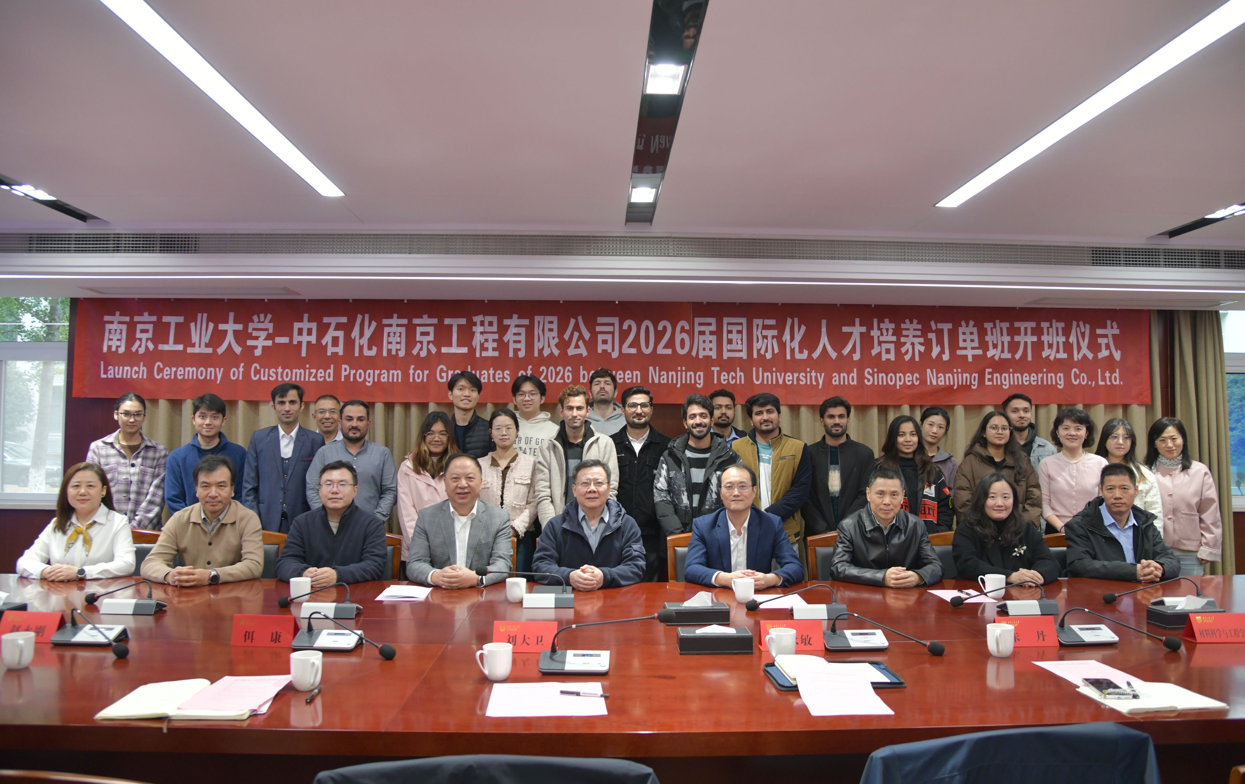 10月21日,公司与中石化南京工程有限公司在明正楼104会议室举行2026届国际化人才培养订单班开班仪式。中石化南京工程有限公司党委书记、执行董事周赢冠,副总经济师、党委组织部(人力资源部)部长陈云祥出席,董事长蒋军成、副董事长刘大卫亲临现场。会议由海外教育公司党总支书记万永敏主持。