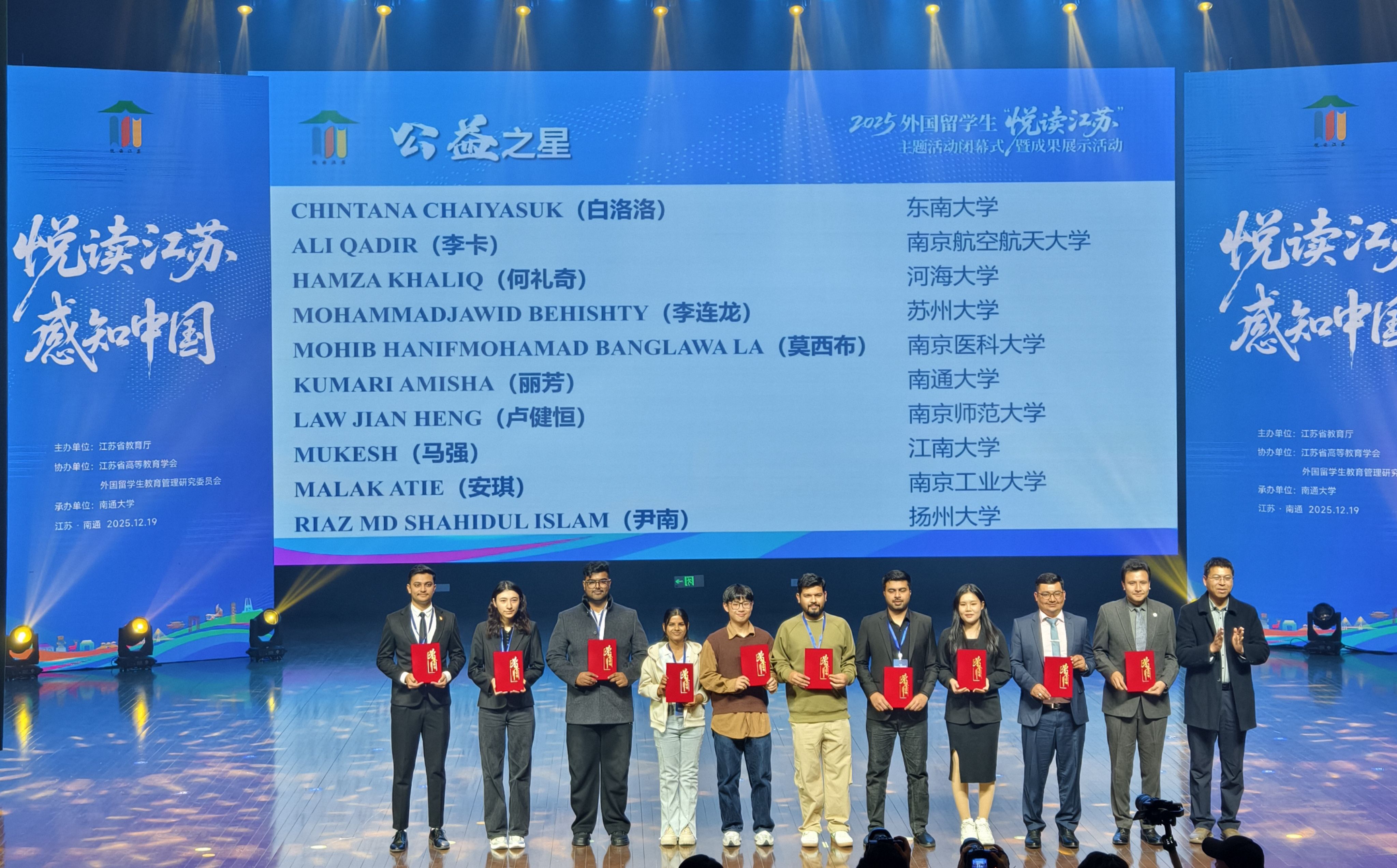 1219日,2025年外国职工悦读江苏主题活动闭幕式暨成果展示会在南通大学举行。省委宣传部、省外办、南通市外办及省内23所高校相关部门负责人、400余名职工代表共同参加。太阳集团tyc151cc副经理朱丹、教师代表钱颖、职工代表参加了闭幕式。公司职工23级国贸专业本科生MALAK ATIE(安琪)凭借其在公益领域的突出表现,荣获悦读江苏首次设立我是说年度人物公益之星荣誉称号。